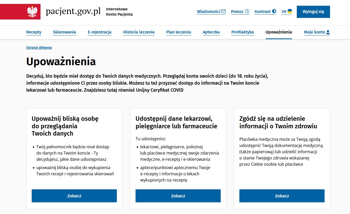 Aby skorzystać z usługi, należy zalogować się na swoje konto stronie https://pacjent.gov.pl/ (profil zaufany, e-dowód lub bankowość elektroniczna), a następnie przejść do sekcji dotyczącej upoważnień.